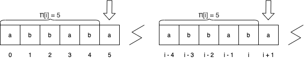 In the example above, πS[i]=5\pi_S[i] = 5, meaning that the suffix of length 55 is equivalent to a prefix of length 55 of the entire string. It follows that if the character at position 55 of the string is equal to the character at position i+1i + 1, then the match is simply extended by a single character. Thus, πS[i+1]=πS[i]+1=6\pi_S[i + 1] = \pi_S[i] + 1 = 6.
