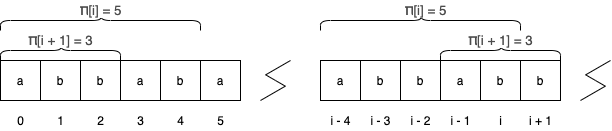 In the general case, however, this is not necessarily true. That is to say, S[πS[i]]S[i+1]S[\pi_S[i]] \neq S[i + 1]. Thus, we need to find the largest index j<πS[i]j < \pi_S[i] such that the prefix property holds (ie S[:j1]S[ij+1:i]S[:j - 1] \equiv S[i - j + 1:i]). For such a length jj, we repeat the procedure in the first example by comparing characters at indices jj and i+1i + 1: if the two are equal, then we can conclude our search and assign πS[i+1]=j+1\pi_S[i + 1] = j + 1, and otherwise, we find the next smallest jj and repeat. Indeed, notice that the first example is simply the case where jj begins as πS[i]\pi_S[i].