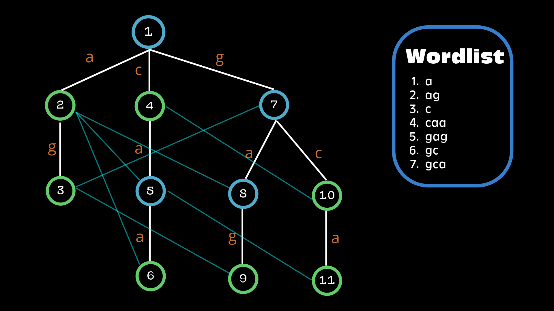 The image below depicts how the structure looks like for the words [a,ag,c,caa,gag,gc,gca][a, ag, c, caa, gag, gc, gca].
